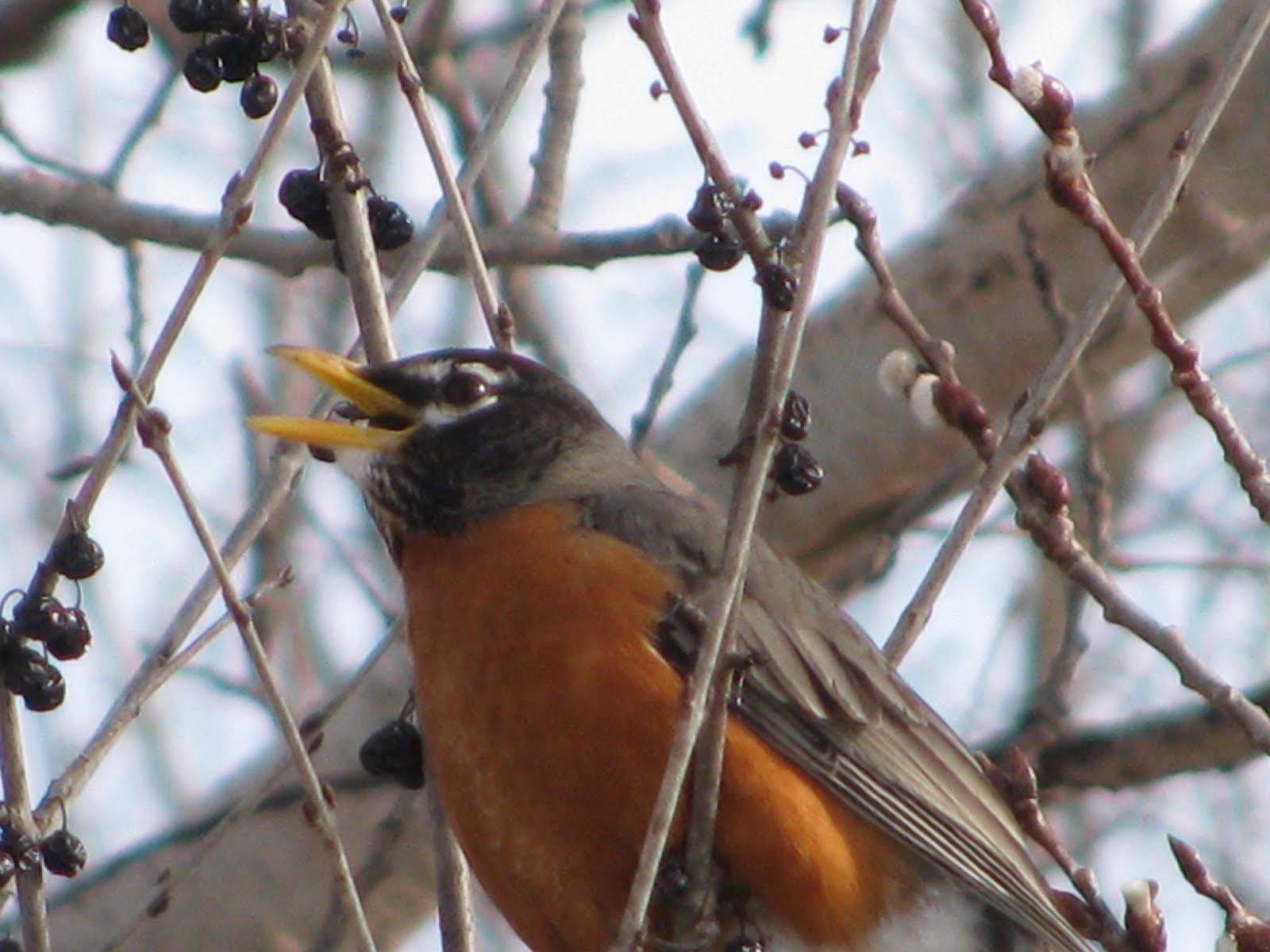 There were a ton of other birds out today and even the Robins were active. Maybe the warm temps last week got them thinking spring. I snapped a photo of this one eating berries off the trees. So for anyone who still thinks Robins only eat worms, here is proof of how they can survive a Minnesota winter. On the north side I got a big surprise when a group of 8 Deer popped into view walking towards me through the woods. To my amazement, 4 of the 8 were Bucks who still had their antlers!